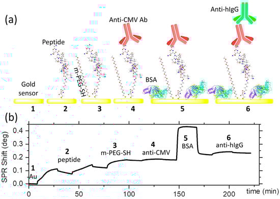 Anti-CMV immunoassay: (a) illustration of the steps of the peptide-based anti-CMV immunoassay and (b) the corresponding SPR response for each step.