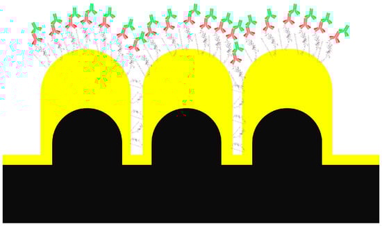 The above estimates neglect the potential effects of the surface distribution at the top of the pillars, where the presence of curvatures could enhance the adsorption processes. We showed recently how nanotopographies could positively enhance the analyte capture efficiency on affinity sensors [53]. The curvature could also influence the distribution of molecules pre-disposing them to the inter-pillar regions [27,53]. In addition, the conformational freedom of the peptide chains could translate into enhancing the capture of anti-CMV antibodies [54,55,56]. While the results demonstrate a high signal enhancement on the PEF sensors in comparison with the bare gold surface, the contribution from the nanostructure variables via their impact on the molecular densities and distributions with respect to the inter-pillar electromagnetic hotspots cannot be excluded. Future work will shed light on the relative contribution of different variables to sensor performance by isolating and investigating them piecemeal. Techniques such as nano-QCM that use nanoarrays on a quartz crystal microbalance sensor, as we showed earlier [27,28,29,53,57], would be particularly well-suited in this respect. Self-assembly approaches, such as that used in this work, that can deliver well-defined nanoarrays on arbitrarily large areas with systematically variable nanostructure geometries at molecular-length scales have profound significance for nanoengineering of optical and bio-interfaces [26,43,58,59].