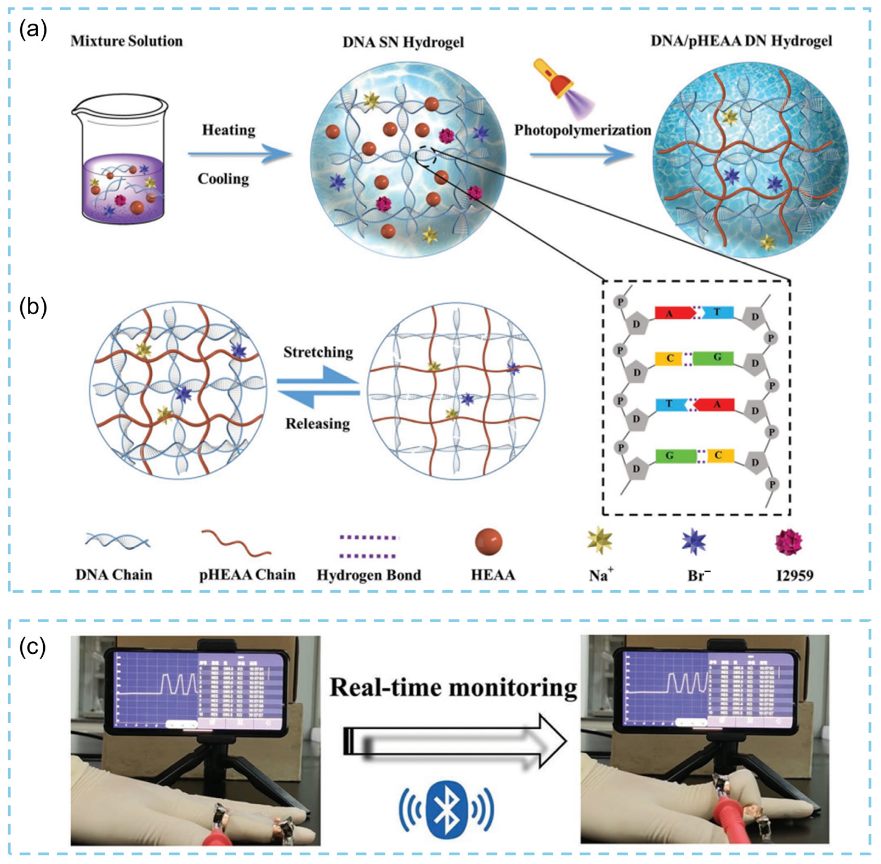 - Tang, L.; Wu, S.; Xu, Y.; Li, Y.; Dai, B.; Yang, C.; Liu, A.; Tang, J.; Gong, L. Design of a DNA-Based Double Network Hydrogel for Electronic Skin Applications. Adv. Mater. Technol. 2022, 7, 2200066. [Google Scholar] [CrossRef]