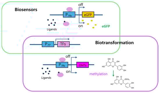 Genetic components for biosensors and Escherichia coli strains for biotransformation. The biosensors consisted of reporter and ligand sensing domain. For biotransformation, the eGFP in reporter domain was replaced with OMTs and the activities of OMTs confirmed the capacity of TF-based systems as gene regulatory systems. OMT, O-methyltransferase; TF, transcription factor.