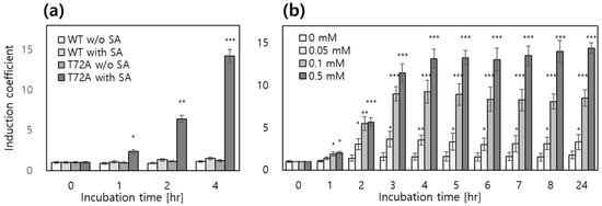 Endogenous marR is present in E. coli; therefore, E. coli-marR was used as the host cell for mar systems. The first point, denoted as 0 h, was the initial incubation period after substrate treatment. In the case of SOMT-2, a difference in methylated apigenin production was observed after 4 h of incubation, and the maximum differences were observed at 6 and 8 h (Figure 6a). Eventually, the biotransformation efficiency, based on the product peaks, was similar when the incubation duration was increased to 24 h. The initial expression of SOMT-2 differed with SA treatment and the amount of SOMT-2 was saturated. If a higher substrate concentration was applied, the differences would be prolonged. Additionally, ROMT-9 under mar systems showed similar patterns to those of SOMT-2 and an approximately two-fold increase in methylated quercetin at 8 h (Figure 6b). However, quercetin diminished after 8 h, which was consistent with the results observed during the biotransformation assay for diverse flavonoids (Figure S2).