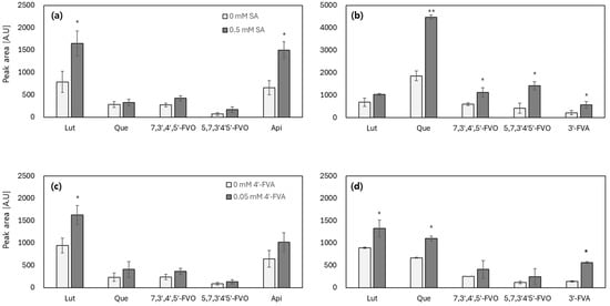 Efficiency of flavonoid methylation by OMTs under the control of mar and ttg operons with their corresponding TFs. (a,b) Biotransformation efficiency of Escherichia coli harboring pMar-SOMT2 and pMar-ROMT9, respectively, regulated by MarR T72A in the presence of 0.5 mM salicylic acid (SA). (c,d) Biotransformation efficiency of E. coli harboring pTtg-SOMT2 and pTtg-ROMT9, respectively, regulated by TtgR F168W in the presence of 0.05 mM 4′-hydroxyflavanone (4′-FVA). The y-axis represents the integrated peak area of methylated products quantified by HPLC and is presented as arbitrary units (a.u.). The data was collected from five independent experiments, and the values were indicated as means ± SD. Asterisks indicate significant differences in data compared with no inducer using by Dunnett’s test (* p ≤ 0.05, ** p ≤ 0.01).
