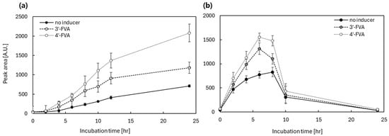 In the biotransformation assays, the production of methylated apigenin and quercetin was higher when induced with 0.05 mM of 4′-FVA than that with 3′-FVA, demonstrating that the ttg-operon system can differentially regulate gene expression depending on the strength of ligand induction. In the case of SOMT-2, enzymatic activity increased in the order of the strength of the inducers (Figure 7a). The production of methylated apigenin increased over time and cells with no inducer showed approximately five times less production. In contrast, ROMT-9 showed a similar pattern, but the quercetin levels started to diminish after 8 h of incubation. Interestingly, quercetin and its methylated derivatives diminished after approximately 8 h of incubation, whereas such disappearance was not observed for other flavonoids. Because no degradation was detected in freshly prepared standards or HPLC-only controls, this loss is presumed to result from metabolic degradation by E. coli, consistent with previous reports that the host bacterium can catabolize quercetin through endogenous oxidative pathways [31,32].