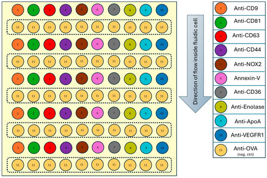 The immunocapture experiments were conducted on the sample originating from both control and treated conditions. The study aimed to evaluate the differences in ligand interactions with samples from two conditions, enabling a comparative analysis under consistent experimental parameters. CD81, CD63, and CD9 targets were selected as markers for ubiquitous EVs. Annexin-V was chosen for its ability to bind phosphatidylserine (PS), which is present on microvesicles. CD44, CD36, and VEGFR1 targets were used as markers for endothelial cells. NOX2 and Enolase targets, while expressed in endothelial cells, were included due to their involvement in toxic mechanisms associated with exposure to environmental contaminants. Anti-ApoA was included in our chip pattern to detect Apoliprotein A, and Anti-OVA as a negative control.