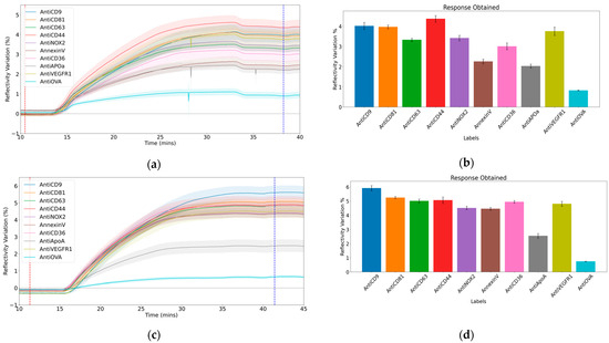 Figure 2a,c illustrate the kinetic curves from two experiments conducted on samples from the control and treated conditions, respectively, depicting the variation in reflectivity (%) over time (minutes) during sample injection (108 particles/mL). An initial increase in reflectivity is observed, followed by distinct interaction patterns as the injection continues, with each ligand family exhibiting unique interactions with the EVs. (Note: Anti-Enolase was excluded from the analysis due to its lack of response which raised uncertainty about its specificity and rendered it unsuitable for the study). The response (Figure 2b,d) was calculated using the formula “End signal—Start signal,” where the end signal represents the stabilized reflectivity variation after the injection, and the start signal denotes the reflectivity variation before the injection began. These points are marked by the dotted blue and red lines in Figure 2a and Figure 2c, respectively.