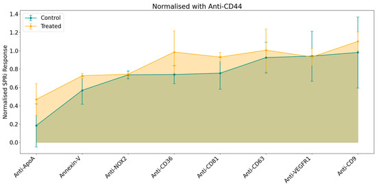 The increased response observed for Anti-CD81 and to a lesser extent for Anti-CD63 and Anti-CD9 in the treated condition compared to controls may be attributed to the elevated production of vesicles under cytotoxic stress. Alternatively, it is also possible that these markers are overexpressed on EVs from the treated condition, leading to higher interaction values.