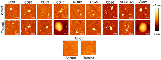 AFM topological images obtained on the EVs captured at different ligands originating from control and treated conditions. The two last images at the bottom correspond to the images registered on a spot composed of the irrelevant anti-OVA IgG as negative control (with the z-scale 40 nm for all the images).