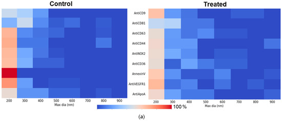 Following the global analysis of EVs captured on various ligands, we decided to refine the investigation on large EVs naturally present in the 10k EV pellet. The resulting heat maps (Figure 5a) reveal, for several ligands, a broader distribution of EV sizes in the treated condition, indicating a shift toward large EVs. The shift is further supported by the difference observed between the treated and control conditions in various size ranges, as shown in Figure 5b, which takes into account the relative size evolution of EVs, for each ligand. Indeed, the percentage of large EVs has been determined in the windows “200–400”, “400–600”, “600–800” and “800–1000” nm, in maximum diameter, in the two conditions (control and treated). A negative value means that there were more lEVs in the control condition. A positive value (highlighted in grey in the table) means that there are more lEVs in the treated condition.