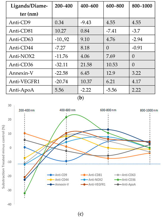 The graph (Figure 5c) shows tendencies of lEV biogenesis under pollutant exposure in the function of the ligand of capture. Based on this representation by maximum diameter size, we clearly discriminate several subpopulations of EVs that reveal a broader distribution of EV sizes in the treated condition, especially those presenting an on-chip phenotype CD36+, PS+, VEGFR1+, CD63+, NOX2+, and CD44+ and, to a lesser extent, CD9+, which is only affected on the largest sizes.