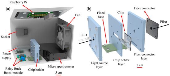As illustrated in Figure 2a, the detection system comprised a buck/boost converter module (DC-DC, 4A-XL6009E1, XLSMIL, Shanghai, China), a micro-spectrometer (SE2020-025-VNIR, SmartEngine, Hsinchu, Taiwan), a 5V power supply (RS-15-5, Meanwell Co., New Taipei City, Taiwan), a relay block (KY-019, SONGLE, Taipei, Taiwan), a Raspberry Pi touch tablet computer (Raspberry Pi 3 Model B, Raspberry Pi Foundation, Tokyo, Japan), a chip holder, and a cooling fan (Axial Fan, RS Co., Ltd., New Taipei City, Taiwan). In the detection process, the detection chamber of the chip was illuminated by a white light LED, and the reaction complex was observed by the micro-spectrometer. The resulting optical signal was passed to the Raspberry Pi via an optical fiber and processed by self-written software to determine the Na+ ion concentration.