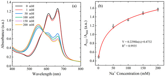 An amount of 100 μL of NaCl standard solutions with known concentrations in the range of 1–200 mM were added to mixtures consisting of 1000 μL of ETH5294, KTFPB, ionophore, and Tris-HCl buffer, and stirred for one min to perform ion exchange. The resulting solutions were analyzed using a UV–visible spectrophotometer (Jasco V-700, Tokyo Corporation, Tokyo, Japan). As the Na+ concentration increased, the solution color shifted from blue to purple. Additionally, as illustrated in Figure 3a, the peak intensity at 555 nm increased, while the peak at 666 nm decreased. Figure 3b displays the variation in the calculated absorbance ratio (A555/A666) as a function of Na+ concentration. A regression analysis showed a logarithmic relationship between the absorbance ratio (Y) and Na+ concentration (X), expressed as Y = 0.2298ln(X) + 0.4732, with a correlation coefficient (R2) of 0.9935. This indicates that the absorbance ratio reliably reflects the Na+ ion concentration within the 1–200 mM range.