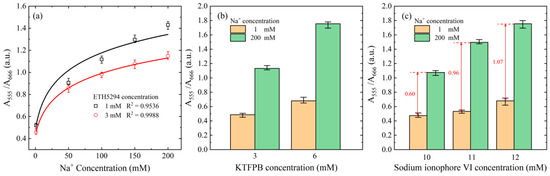 (a) Variation in different ETH 5249 concentrations with sodium ion concentration in the range of 1 mM to 200 mM. (b) Differences in absorbance ratios among different concentrations of KTFPB were investigated under sodium ion concentrations of 1 mM and 200 mM. (c) Differences in absorbance ratios of different ionophore concentrations to 1 mM and 200 mM sodium ion concentrations.