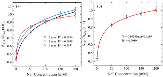 (a) Variation in absorbance ratio A555/A666 with Na+ concentration given different PMMA layer thicknesses. (b) Variation in absorbance ratio A555/A666 with Na+ concentration given optimal reaction conditions and chip thickness.