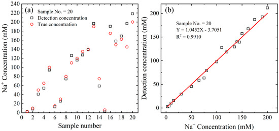(a) Detection results for 20 serum-based Na+ samples, and (b) correlation between detection results and experimental measurements for 20 serum-based Na+ samples.