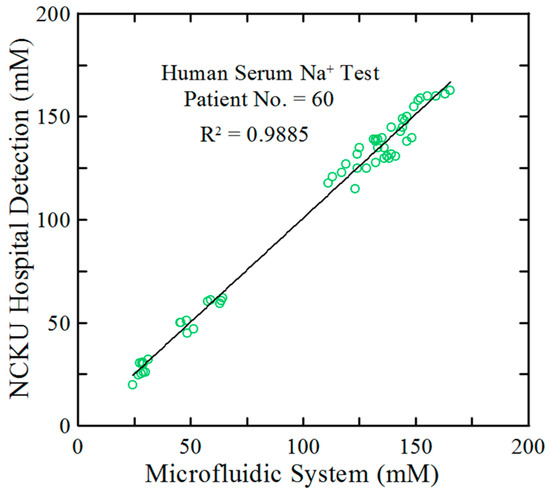 Table 2 compares the basic characteristics and performance of the proposed platform with that of several other Na+ detection methods reported in the literature. The practical feasibility of the proposed system was further assessed using real serum samples from 60 CKD patients at National Cheng Kung University Hospital (NCKUH) in Taiwan. For comparison, the Na+ concentrations in the samples were also measured using the conventional indirect ion-selective electrode (ISE) method (cobas® 8000 modular analyzer, Roche Diagnostics, Switzerland, Basel). In order to evaluate the detection performance of the current rapid microfluidic ion-exchange optode detection system for lower Na+ concentrations (i.e., below 100 mM), 40 samples with Na+ concentrations ranging from 110 mM to 150 mM were collected from NCKUH. Then, the 20 original samples were taken and each of them were diluted 2.5-fold and 5-fold with deionized water to obtain an additional 40 samples. The results are presented in Figure 7, demonstrating a strong correlation coefficient (R2 = 0.9885) between the two sets of results over the considered Na+ range. Furthermore, the proposed system exhibits impressive average recoveries and standard deviations of 99.4% and 4.5%, respectively, compared to reference measurements, confirming its suitability.