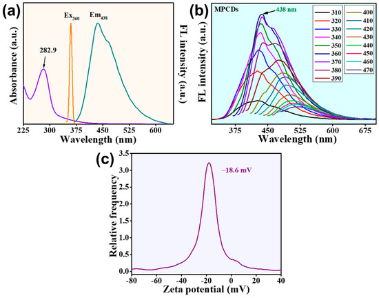 (a) UV spectra and maximum excitation and emission spectra of MPCDs. (b) Photoluminescence spectra of MPCDs at different excitation wavelengths (310–470 nm). (c) Zeta potential of MPCDs.