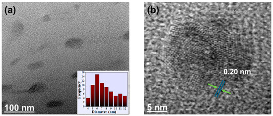 (a) Transmission electron microscopic (TEM) image and distribution of particle size (inset) of MPCDs. (b) High-resolution TEM image of MPCDs.