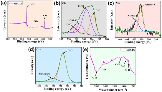 (a) XPS survey scan of MPCDs with corresponding deconvoluted spectra of (b) C1s, (c) N1s, and (d) O1s. (e) FTIR spectra of MPCDs.