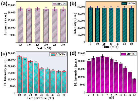 The fluorescence intensity of MPCDs in different conditions: (a) in NaCl ionic solutions (0.5–3 M), (b) at 365 nm UV irradiation (0–60 min), (c) at temperatures varying from 10 to 50 °C, and (d) in different pH buffers (3–13). The error bars show the standard deviations calculated from three separate experiments.