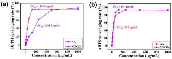 The ability of MPCDs to scavenge radicals was evaluated using two widely employed chemical-based methods, namely DPPH and ABTS.