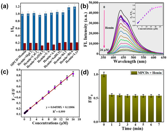 Before performing a hemin detection analysis, we evaluated the selectivity of the MPCDs towards hemin, taking into account the intricate nature of actual samples. Figure 6a illustrates that the fluorescence intensity of the MPCDs remained almost unchanged with the addition of interferents at a concentration of 200 µM.