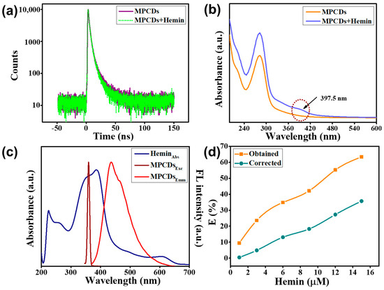 The fluorescence quenching phenomenon responsible for the detection of hemin by MPCDs was further investigated using various optical experiments such as fluorescence lifetime decay, UV spectra, and fluorescence spectra. Figure 7a displays the lifetime decay curves of MPCDs without and with hemin.