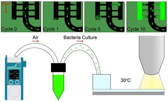 The experimental set up is depicted in Figure 2d. A pressure controller (Fluigent, Flow EZ, Singapore) is used to provide pressure for driving fluids from the respective reservoirs into the microfluidic device. The pressure controller is first attached to a reservoir filled with 20 mL of culture media and maintained at 200 mBar for 1 h to prime the microfluidic device before introducing the bacteria culture. To fill the bacteria culture, 1 mL reservoirs filled with the bacteria culture are replaced with the media reservoir and flowed at a pressure of 50 mBar for 3 h. The microfluidic chip is connected to a waste reservoir throughout the experiment. A flow sensor (Fluigent, Flow Unit M) is integrated in the inlet tubing before the chip for flow rate measurement. It was experimentally measured that pressurizing at 200 mBar delivers a flow rate of 0.12 µL/min or 5.5 × 10−3 m3/s within the device. This result was subsequently used for simulations.