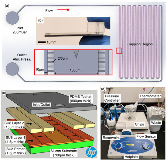 (a) Schematic diagram of a microfluidic chip. Insets show the two sections of the device used in flow simulations. (b) Image of a final chip used during experiments. The scale bar denotes 10 mm. (c) 3D exploded view of layers in chip. (d) Experimental setup.