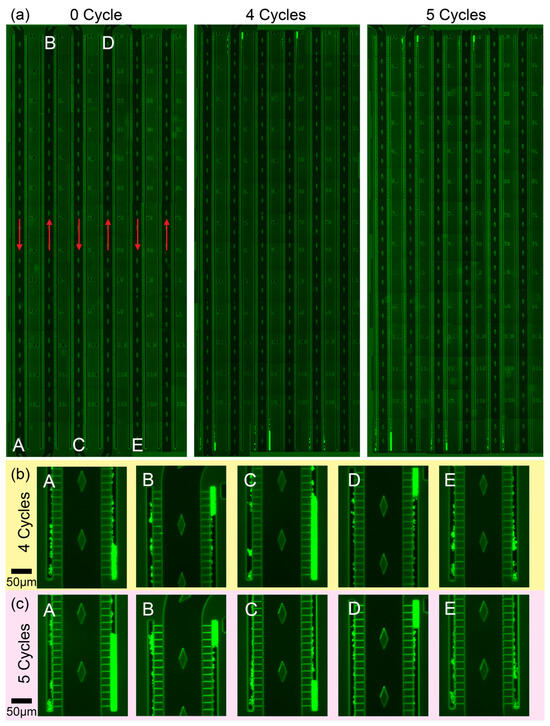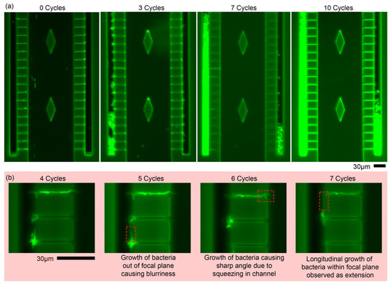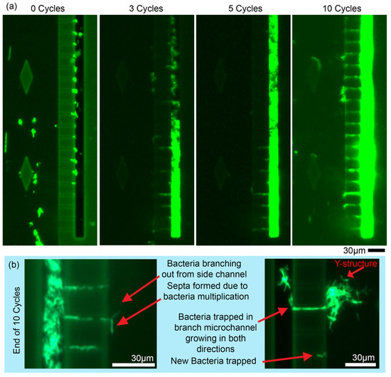 Individual microscope images were stitched together manually across the trapping region of the microfluidic device to reveal trapping patterns within a single device (see Figure 3a). At the start of the experiment (see 0 cycle in Figure 3a), bacteria were unable to be identified at this magnification as these were trapped individually within the branch microchannels. Separate experiments were carried out below to reveal trapped bacteria at a slightly higher magnification below. After leaving the device to run, observations at the end of the 4th cycle revealed that the majority of the trapped bacteria were found at the side channels before the entrance of each bend (see Figure 3b). This trapping phenomenon was in accordance with observations from simulations as given in Supplementary Materials Figure S2.