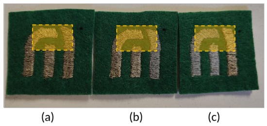 To manufacture the sensors, some considerations are made. WEs and CEs were embroidered with the same yarn since they were used as feeding electrodes. Meanwhile, the RE was embroidered with the other kind of yarn. Based on these requirements and materials used, three types of sensors were defined, and they are summarized in Table 2. Sensor Type A was fabricated entirely with silver-coated yarns on all of its electrodes, as a reference sensor; Sensor Type B used silver-coated yarns for the CE and WE, and stainless steel yarns for the RE. Sensor Type C was built with stainless steel yarns for the CE and WE, and silver-coated yarns for the RE. Figure 2 shows the different manufactured electrochemical sensors.