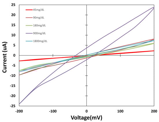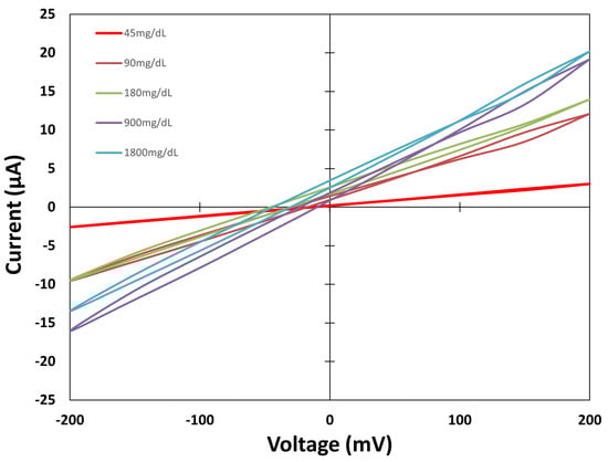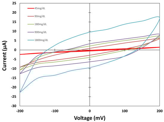 Figure 8 shows the values measured from the Sensor Type C group of sensors. This design shows a more recognisable cyclic voltammetric shape. The Faradaic currents are higher on the electrodes of Sensor Type C, and the values increase as the solutions’ concentration increases., denoting the difference in the oxidation and reduction processes for different concentrations. As a result, the current measured increases as the concentration increases. After the presentation of the cyclic voltammetric curves for the three cases studied, the effect of capacitive currents is observed on the lowest concentration. The values measured for the 45 mg/dL concentration are slightly different between the three sensor types, showing the capacitive background currents present on the sensors. As the solution concentration increases, the Faradaic currents provoked by the oxidation reduction processes increase; however, the effect of capacitive currents is still present on the sensors.