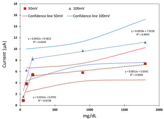 The dependence of the current measured with a glucose concentration is deeply analysed for Sensor Types A and C in this section. The cyclic voltammetric results provide the information to locate the best feeding voltage. Specifically, the voltage ranges for each electrochemical sensor presented higher linear behaviour. Sensor Type A was analysed at 50 mV and 100 mV voltage points, while Sensor Type C behaviour was analysed at 50 mV and −50 mV. Both linear regression studies also present the confidence zone for each regression group for a 95% confidence interval.