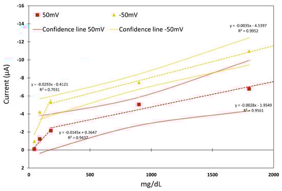 Figure 10 shows the Sensor Type C linear regression study for voltages of 50 mV and −50 mV, which were observed to be the more sensitive feeding voltages according to the results in Figure 7. Regarding Sensor Type A, two different tendencies, above and below 180 mg/dL, can be observed for each feeding voltage. The results denote a better linear dependence for higher concentration values with a of up to 0.9952 for −50 mV feed voltage.