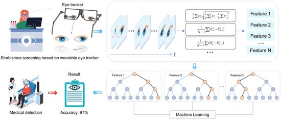 The aforementioned issues present a risk of missing the optimal treatment window for patients with strabismus. Moreover, in developing countries, limited medical resources impede the feasibility of widespread screening using traditional methods. To address this challenge, in recent years, automatic screening based on eye tracking has begun to provide objective diagnoses for strabismus and alleviate medical burdens [11,12,13,14]. To date, several research findings have demonstrated state-of-the-art techniques capable of detecting strabismus with acceptable accuracy [15,16,17,18,19,20,21,22,23,24,25]. For example, Nixon et al. [26] presented an automated method for screening strabismus (“Strabismus screening Test using Augmented Reality and Eye-tracking”: STARE). The patient’s task was to fixate on a physical target for the 60 s with their eye movement being tracked. The results demonstrated that STARE could detect moderate and severe cases of horizontal strabismus with reasonable (87%) sensitivity, indicating its potential for effective non-invasive screening. Zheng et al. [27] developed a deep learning (DL) model for screening referable horizontal strabismus based on primary gaze photographs, using clinical assessments as a reference. The model was trained on 9402 images and demonstrated an accuracy of 95% in diagnosing referable horizontal strabismus. Chen et al. [28] proposed recognizing strabismus using eye-tracking data and convolutional neural networks. (CNNs). The eye movements of the subjects were recorded and transformed into gaze deviation (GaDe) images, which were then processed through a CNN that has been pretrained on the ImageNet dataset. This method was tested on a dataset comprising both strabismic and normal subjects, with a maximum accuracy of 95.2%.