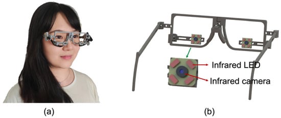 In this study, we use a wearable eye tracker prototype developed by our research group and a laptop computer to perform data collection. The eye tracker prototype is composed of a 3D-printed glasses frame (printed by Creality’s CR-6 SE, Creative 3D Technology Co., Ltd., Shenzhen, China) and two small near-infrared cameras equipped with four infrared LED lights (Huibo vision Jie technology Co., Ltd., Shenzhen, China), with a total cost of 40 GBP. The camera has a frame rate of 30 Fps, 12 million pixels, a field of view of 80 degrees, and a focal length of 3.95 mm, which enables effective tracking of the subject’s eye movements. The structural and wearing diagrams of the eye-tracker model are presented in Figure 2.