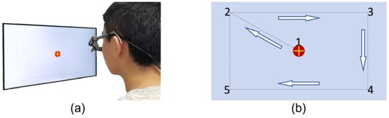 Given the extensive age range of the subjects, a variety of potential complexities may arise during the actual experiment, which include instances of children exhibiting involuntary movements during the test, fluctuations in experimental lighting, and uncertainty regarding the experimental position due to height. To emulate the circumstances typically encountered in routine strabismus screening, we do not impose certain specific constraints on the experimental parameters. The subjects are seated in a comfortable position and observe the oscillating yellow plus center light spot on the screen, as illustrated in Figure 4a. The light spot initially flashes in the center of the screen for a period of three seconds, after which it moves uniformly along a dotted line in accordance with the sequence of the number “1-2-3-4-5-2”, as shown in Figure 4b, for a total duration of 20 s. The eye tracker records the infrared grey image of the eye in real time, with 540 grey images being recorded for each eye during the experiment.