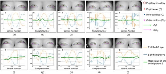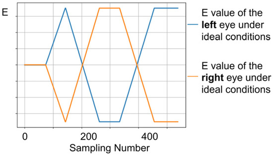 The ratio of the projection length of vector in the direction of vector to the mode length is used as the dimensionless parameter value E for each eye image sampling, as described in Equation (4). For each subject, the left eye parameter group , the right eye parameter group , and their mean values are obtained. , , and correspond to the blue, orange, and green curves in Figure 5, respectively (the red is the curve after filtering and smoothing the median value of ). If there is no clear indication in the following, m = 1, 2,…, N, N is 540.