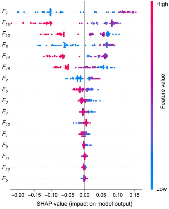 In addition to the performance metrics, we conduct an in-depth analysis of the 16 eigenvalue contributions using SHAP values, as illustrated in Figure 8. This analysis aims to gain a more comprehensive understanding of the decision-making process of the RF model and to provide an effective reference for the physician’s further diagnosis. The weights of the eigenvalues are calculated, and it is found that five eigenvalues have weight values above 0.1. F15 is slightly lower (0.088), and the remaining eigenvalues have weight values below 0.05. Following the deletion of the 10 features with low weights and their reclassification, the accuracy rate is found to be 95.7%, which still represents a high level of classification performance. However, after deleting the six most important features, the accuracy rate decreases significantly to 74.3%, as shown in Figure 9a,b. Consequently, our focus shifts to interpreting the six eigenvalues that had the greatest impact.