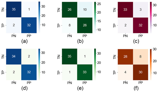 Classification matrix with reduced eigenvalues. (a) 95.7% accuracy for deleting 10 features with low-weight values. (b) 74.3% accuracy for deleting 6 features with high weight values. (c) 92.9% accuracy for deleting and . (d) 94.3% accuracy for deleting and . (e) 97.1% accuracy for deleting and . (f) 82.9% accuracy for deleting , , , and .