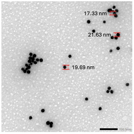 Dextrin-capped gold nanoparticles (GNPs) were synthesized according to a method previously described []. The materials used were gold (III) chloride trihydrate (HAuCl4), sodium carbonate (Na2CO3), dextrin, and sterile water. The quality of the GNPs was confirmed by measuring the maximum absorbance from 518–522 nm using the NanoDrop One (version 2.9). To characterize the size of the GNPs, TEM images were taken and a sample of 40 GNPs were measured, using ImageJ software version 1.54 g []. The average diameter was 19.64 ± 1.39 nm and ranged from 16.61 to 22.53 nm. Figure 1 shows the TEM image where the measurements were taken.