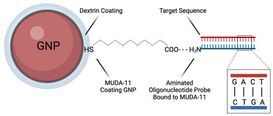 A dextrin-capped GNP is coated with MUDA-11, which is bound to an aminated oligonucleotide probe. If the target sequence is present in the sample, it binds with the probe.