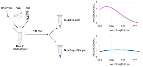 The plasmonic biosensor utilizes GNPs, single-stranded oligonucleotide probes, and sample DNA. To each sample tube, 5 μL of probe, 5 μL of GNPs, and 10 μL of sample DNA were combined and pipette mixed. The oligonucleotide probes were diluted to a concentration of 25 μM. The sample DNA was diluted to either 20 ng/μL or 2.5 ng/μL depending on the extraction method detailed below. The sample tubes were placed in a thermocycler to denature the sample DNA for 5 min at 95 °C, anneal the DNA to the probe for 10 min at 55 °C, and cool for 1 min at 27 °C. Then, the optimized volume of HCl was added. This general principle and the methods are shown in Figure 3.