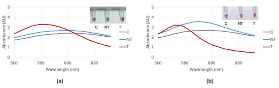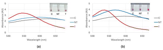 The biosensor is based on the unique surface plasmon resonance (SPR) properties of GNPs, which are caused by the coherent oscillation of free electrons []. This oscillation reaches a maximum at a specific frequency or SPR, and this induces a strong absorption of light that can be measured using a spectrophotometer []. The SPR band intensity and maximum depend on the size and shape of the GNPs [,]. Other studies have shown that GNPs smaller than 30 nm have a maximum oscillation range of 500 nm to 540 nm [,]. The GNPs used in this assay are 16.61–22.53 nm in diameter, with an absorption wavelength from 518 to 522 nm. When GNPs aggregate, it causes a shift in the SPR band and results in a visible color change []. This property is used in this assay to distinguish between a target (positive) and a non-target (negative) sample after adding HCl to induce agglomeration. The MUDA-coated, dextrin-capped GNPs link with the aminated probe to create a GNP–probe complex. It is hypothesized that when the target DNA sequences bind to the probe, the target–probe binding will prevent the GNPs from aggregating, which indicates a positive sample. When the GNPs aggregate, it indicates a negative sample. The distance-dependent nature of the SPR band allows this color change to be measured using a spectrophotometer.