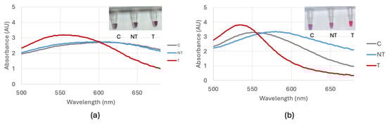 (a) Optimization of the blaOXA-1 probe visual and spectral result for 7 μL comparing the control (C), non-target E. coli C-3000 (NT), and target E. coli BAA-2471 (T) using DNA extracted with a DNA extraction kit. (b) Optimization of the blaOXA-1 probe visual and spectral result for 6 μL comparing the control (C), non-target E. coli C-3000 (NT), and target E. coli BAA-2471 (T) using DNA extracted through boiling.