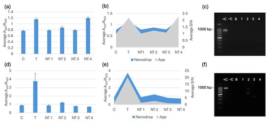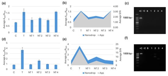 (a) Average A520/A620 for the blaNDM-1 probe 1 with DNA from a kit 10 min after 0.1 M HCl addition. (b) App data average S/N values compared to the A520/A620 for the blaNDM-1 probe 1 with DNA extracted with a kit 10 min after 0.1 M HCl addition. (c) PCR verification for blaNDM-1 using DNA extracted with a kit. (d) Average A520/A620 data of the selectivity analysis for the blaNDM-1 probe 1 with DNA extracted through boiling 10 min after 0.1 M HCl addition. (e) App data average S/N values compared to the A520/A620 for the blaNDM-1 probe 1 with DNA extracted through boiling 10 min after 0.1 M HCl addition. (f) PCR verification for blaNDM-1 using DNA extracted via boiling.
