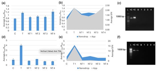 (a) Average A520/A620 for the blaOXA-1 probe with DNA from a kit 10 min after 0.1 M HCl addition. (b) App data average S/N values compared to the A520/A620 for the blaOXA-1 probe with DNA extracted with a kit 10 min after 0.1 M HCl addition. (c) PCR verification for blaOXA-1 using DNA extracted with a kit. (d) Average A520/A620 data of the selectivity analysis for the blaOXA-1 probe with DNA extracted through boiling 10 min after 0.1 M HCl addition. (e) App data average S/N values compared to the A520/A620 of the selectivity analysis for blaOXA-1 probe with DNA extracted through boiling 10 min after 0.1 M HCl addition. (f) PCR verification for blaOXA-1 with DNA extracted via boiling.