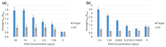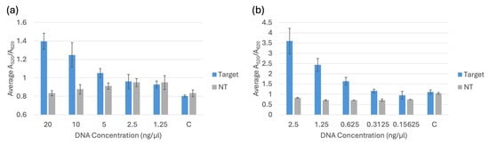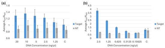 (a) Average A520/A620 for the blaOXA-1 probe comparing different concentrations of target and non-target (NT) DNA extracted using a commercial kit and a negative control (C). (b) Average A520/A620 for the blaOXA-1 probe comparing target and non-target (NT) DNA extracted through boiling and a negative control (C).