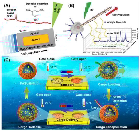 Self-propelled SERS-active MNMs: (A) Schematic illustration of self-propulsion gold/silver nanomotors serving as mobile SERS sensors []. Copyright © 2019 WILEY-VCH. (B) Schematic illustration of photocatalysis-powered matchlike nanomotors for light-guided SERS sensing []. Copyright © 2018 WILEY-VCH. (C) Schematic illustration of the SERS-active MNM and its controllable targeting, temperature-responsive loading, encapsulation, and release []. Copyright © 2022 American Chemical Society.