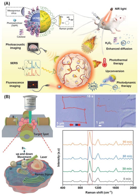 Self-propelled SERS-active MNMs: (A) Schematic illustration of the dual-source powered MNMs for SERS biosensing and multimodal cancer phototheranostics []. Copyright © 2022 Elsevier Ltd. (B) Schematic illustration, motion snapshots and Raman spectra of targeted cellular SERS sensing by the nanoenzymatic MNMs []. Copyright © 2023 Royal Society of Chemistry.