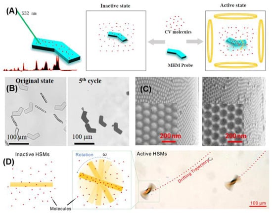 Magnetically propelled SERS-active MNMs: (A,B) Schematic illustration of the SERS enhancing principle and optical images of magnetically actuated hydrogel-based achiral planar microswimmers []. Copyright © 2023 Frontiers Media. (C,D) SEM images of Au nanostructure arrays on the tubular MNMs and schematic illustration of the SERS enhancement effect in accelerating the molecular adsorption []. Copyright © 2020 American Chemical Society.